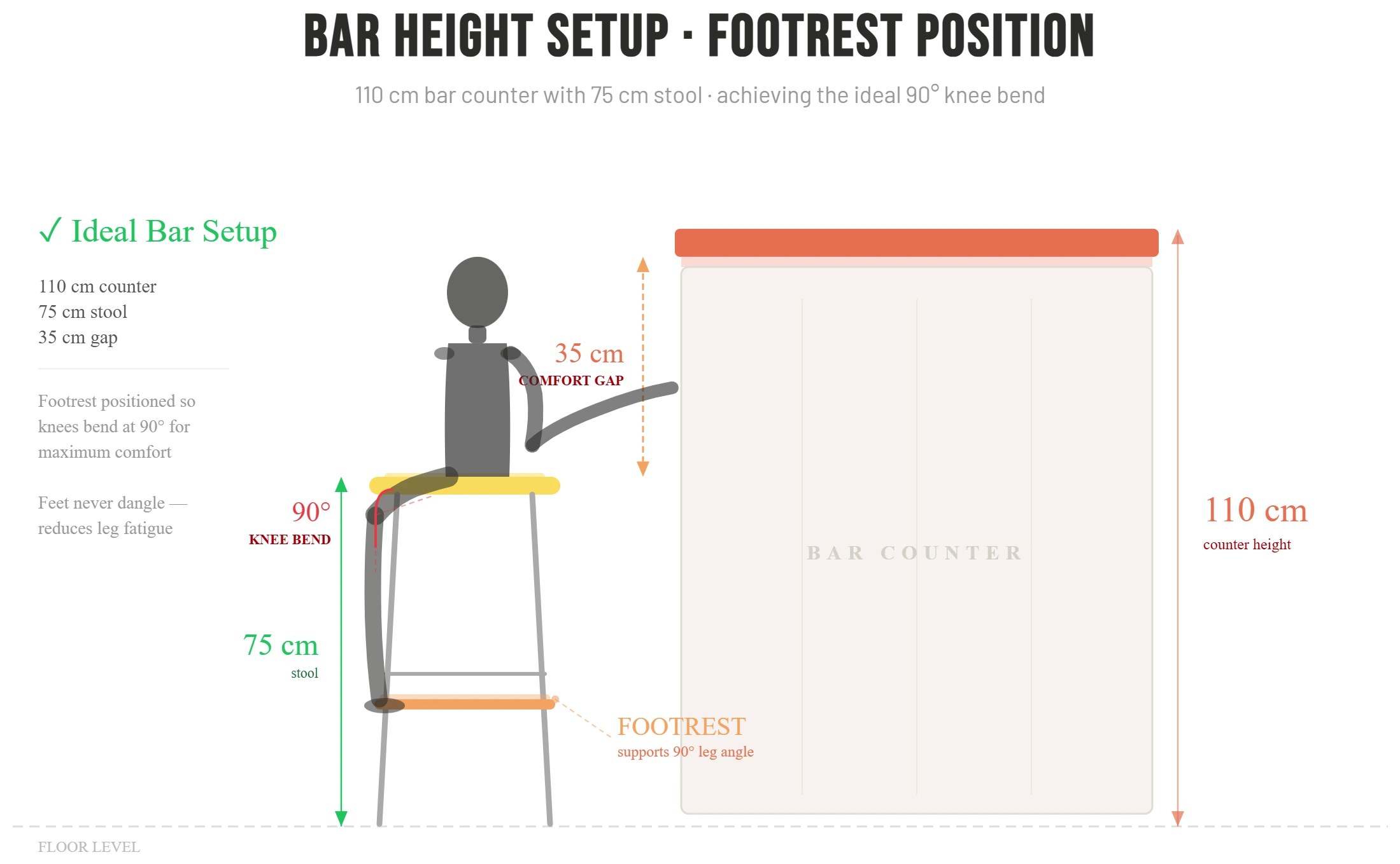 Get this wrong by even 5cm and you’ll notice it within minutes. Too high, your knees hit the counter. Too low, your shoulders hunch forward to reach your plate. Either way, the stool ends up decorative — not used.