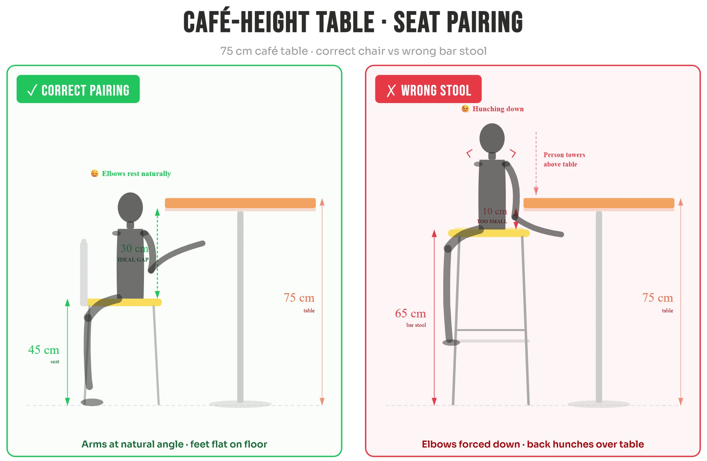 Café and Dining Tables (73–78cm) Need a 43–50cm Seat