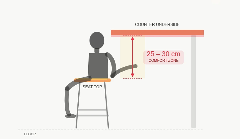 A bar stool height guide is a sizing reference that matches your counter’s measurement to the correct seat height — keeping a 25–30cm gap between the top of the seat and the underside of the counter so your thighs sit comfortably without pressing upward.