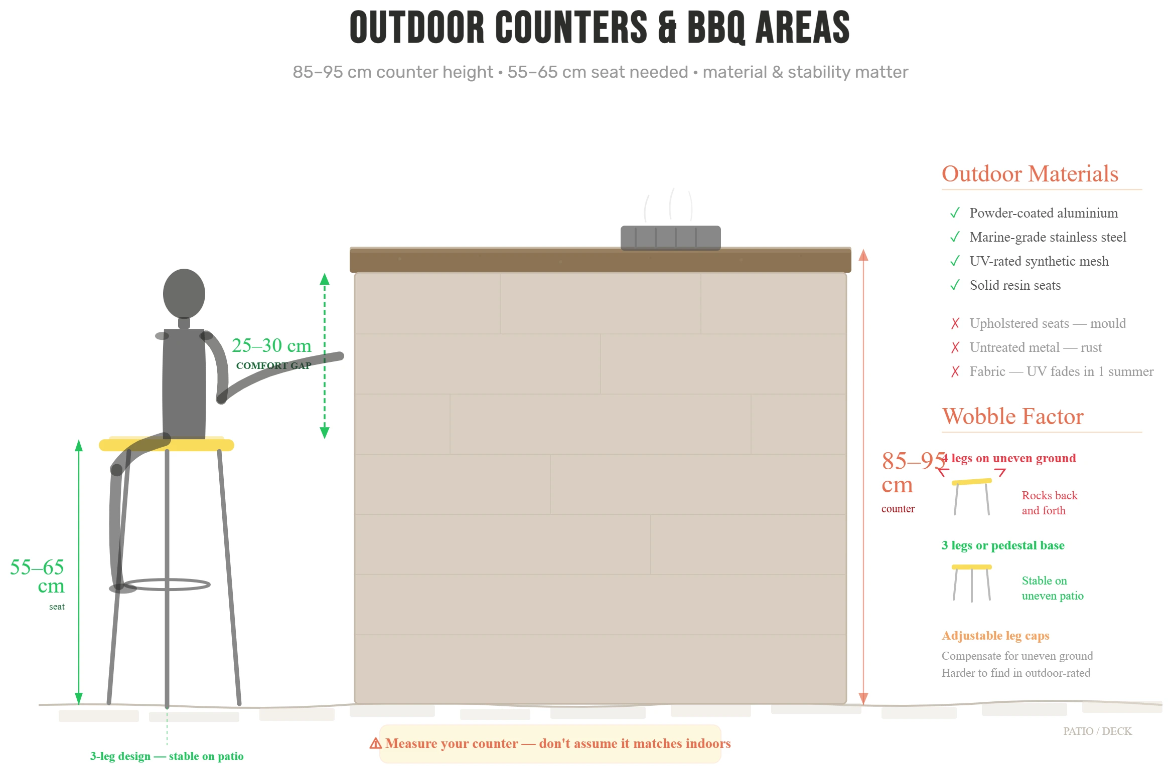 Outdoor Counters and BBQ Areas (85–95cm) Need a 55–65cm Seat