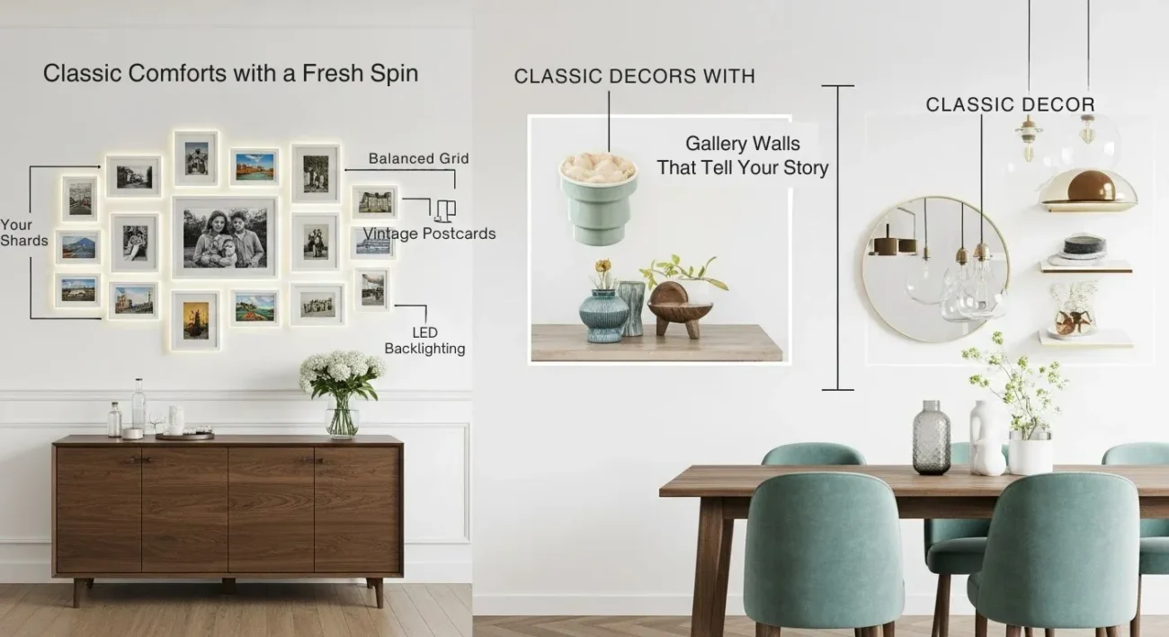 Gallery Walls That Tell Your Story: Although the urge to place the eclectic picture frames that look like them in a yard sale is strong, a more professional approach to the arrangement will produce a better sound. And imagine an exhibition of a single grid with the black-and-white portraits of family members scattered with the old postcards of the journeys in the past. Another secondary method, used in modern interior design, is to fit small LEDs strips behind the frames; this creates a low level of light intensity such that the walls seem to be driving a quiet and low profile DJ set in the background above the dining table.