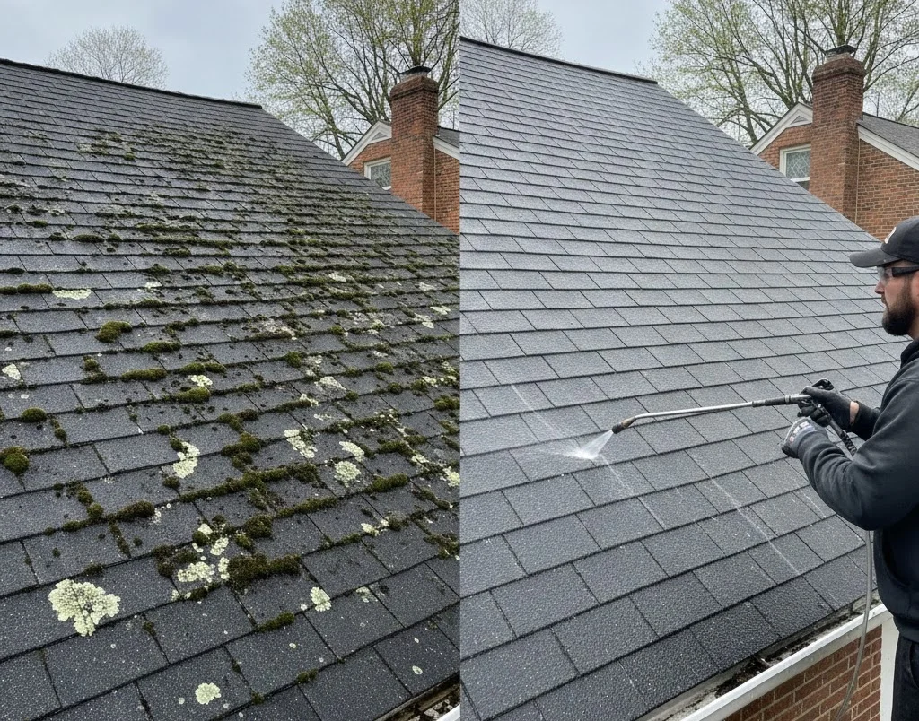Mixed-material properties (which describe half of Baltimore County) require switching between approaches mid-job. Wood trim around brick windows, painted surfaces next to natural stone – each section gets treated according to what it actually is, not some universal setting.