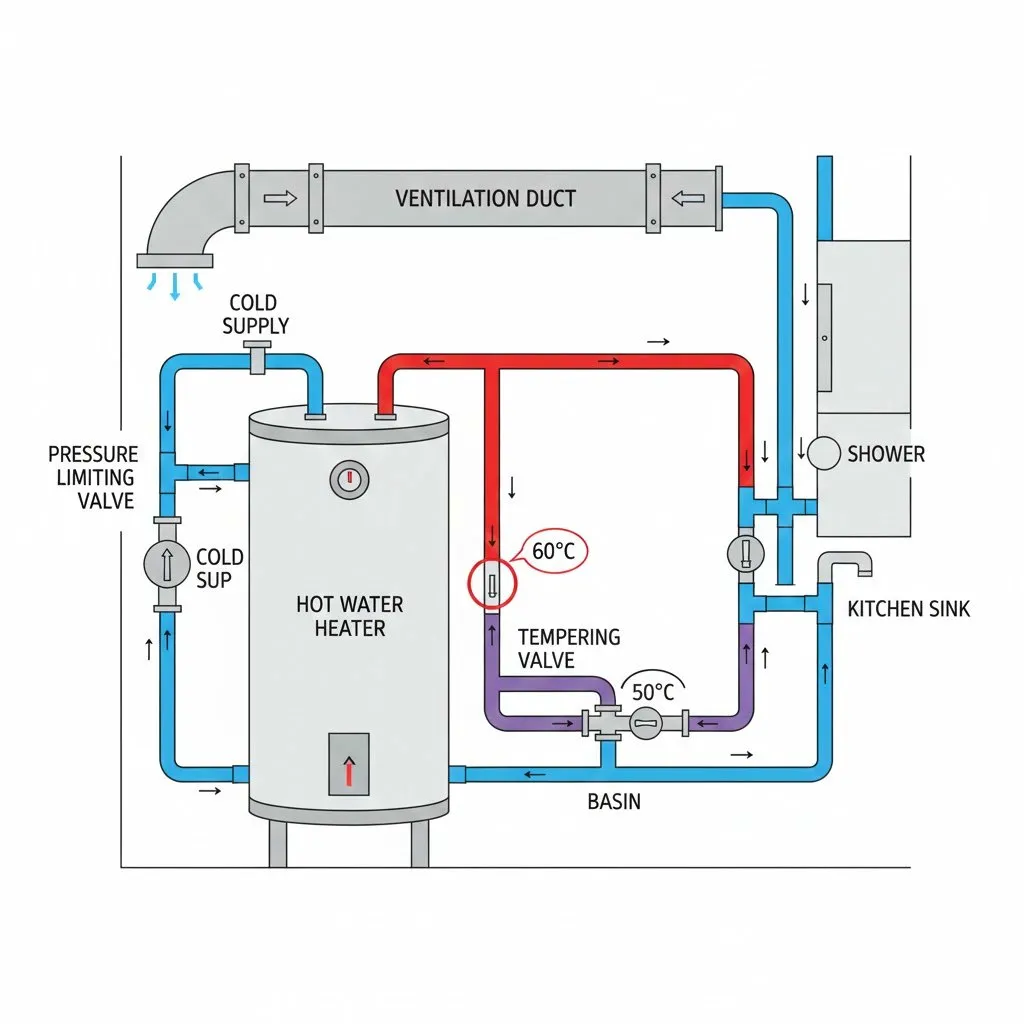 NCC 2022 caps hot water at 50°C at bathroom fixtures. Store it at 60°C or higher—that’s what kills Legionella—then temper at the point of use with a tempering valve. After commissioning, stick a thermometer under the farthest tap and check it’s actually hitting 50°C, not scalding or lukewarm.
