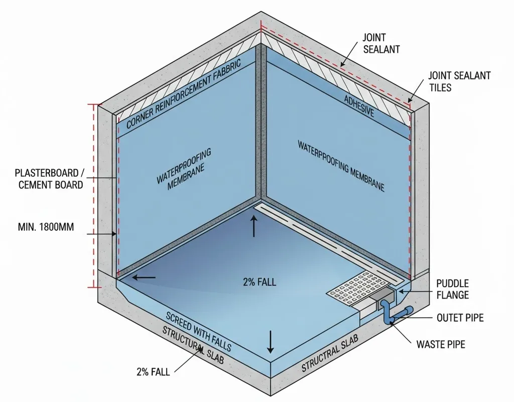 Sort your membrane system before anyone starts work. Membrane type, compatible primer, how many coats, total dry film thickness, and curing intervals between them. Check that the membrane plays nicely with your tile adhesive. Puddle flanges at drains, bond-breakers at junctions, reinforcing fabric in corners.