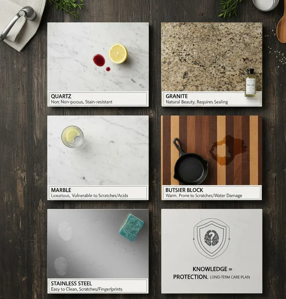 Every kind of countertop material has its own character. For example, quartz is designed to be non-porous and stain-resistant, while granite is unparalleled in terms of its natural beauty but requires sealing at intervals. Although marble is luxurious and timeless, it is now quite vulnerable to abrasions and acids. Butcher block and other wood counters offer a lot of color and complexity, but they can be scratched or ruined by water if not properly maintained. Professional kitchens frequently utilize stainless steel because it is easy to clean and long-lasting, but it is also vulnerable to scratches and fingerprints. With each of these cases, knowing about the properties of the counter top material gives you the knowledge to develop a care plan that protects you from the typical problems with you material and create a stronger long-term plan.