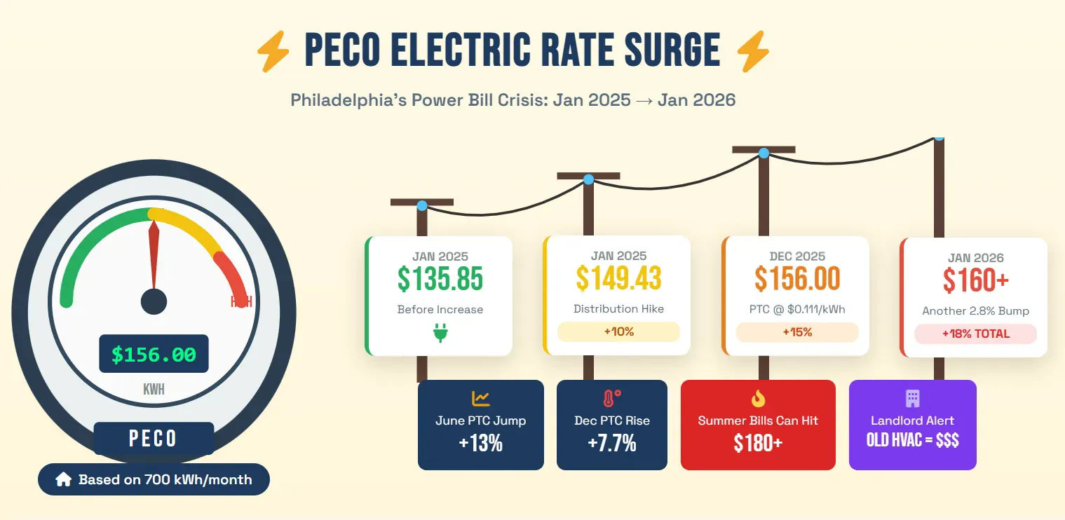 Electric took the hardest hit percentage-wise. PECO’s distribution rate increase kicked in January 1, 2025, pushing a typical 700 kWh residential bill from about $135.85 up to $149.43 pretty much overnight. That 700 kWh figure is what PECO uses as their benchmark for an average household, though actual usage swings wildly depending on whether you have window AC units, electric heat, or tenants who leave every light on.