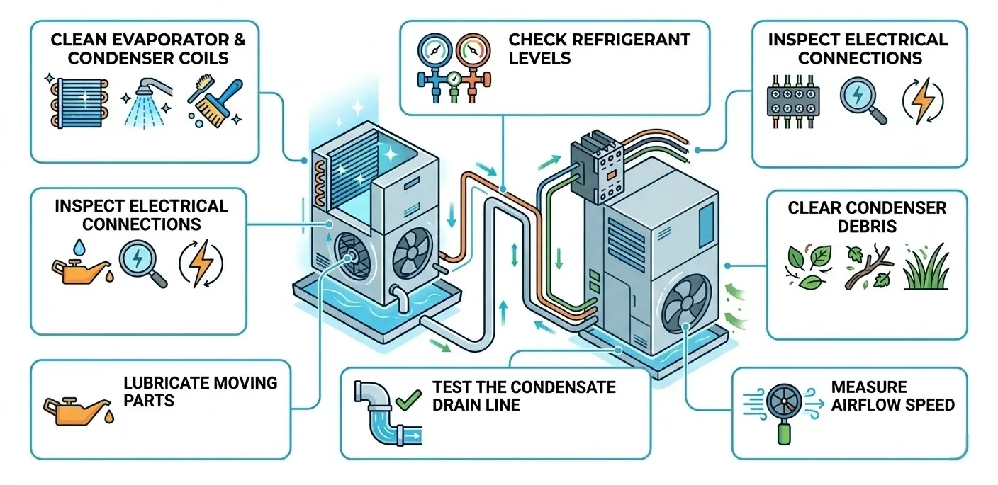 - Cleaning evaporator and condenser coils (dirty coils kill heat transfer efficiency)